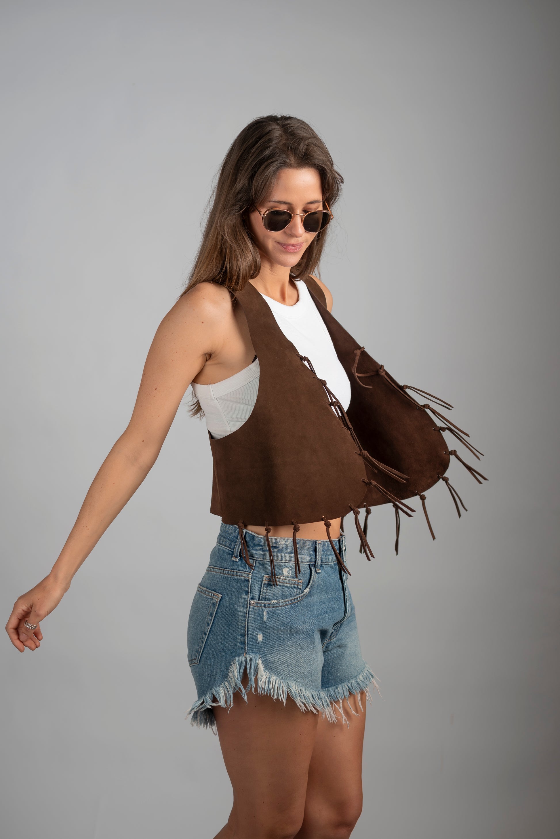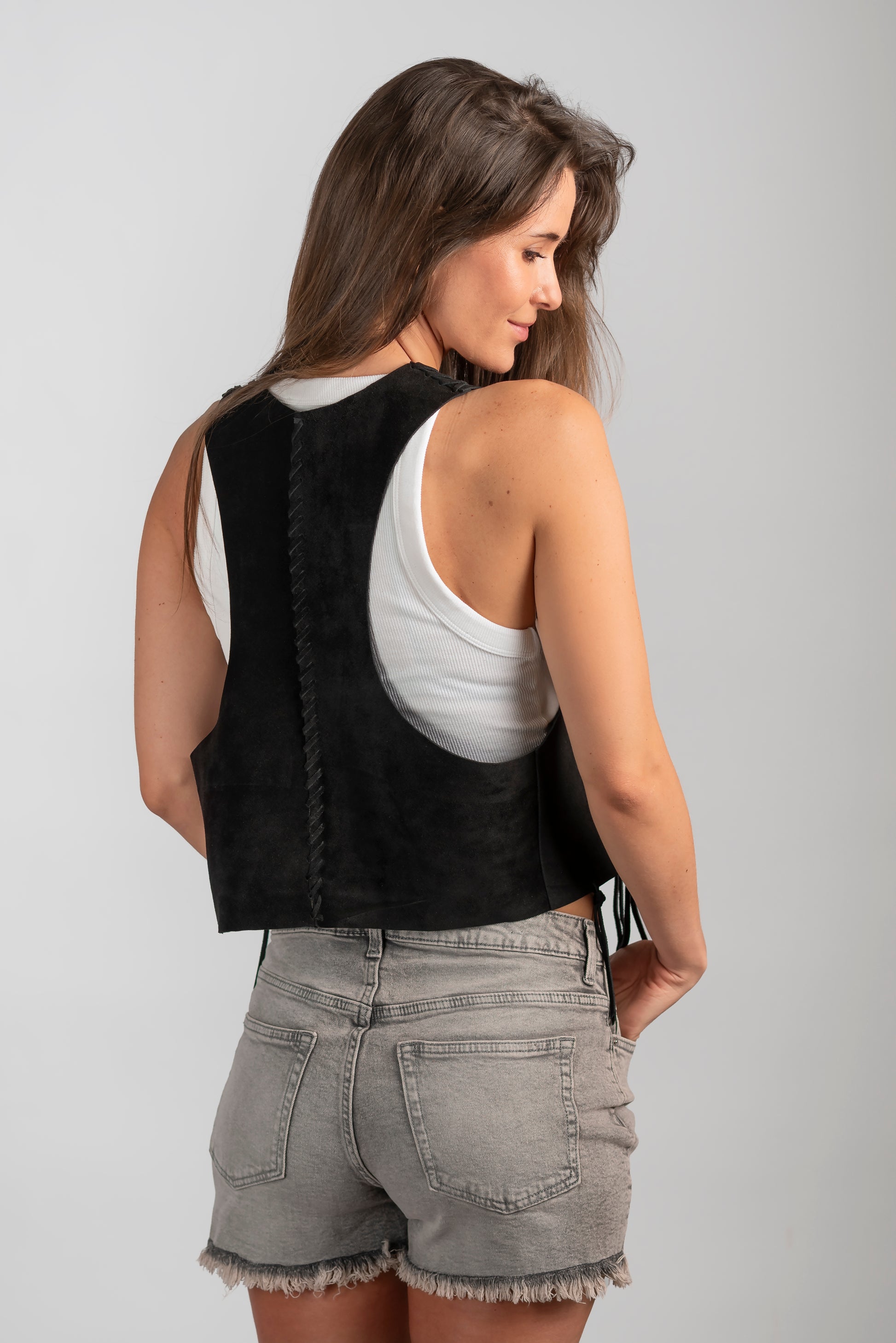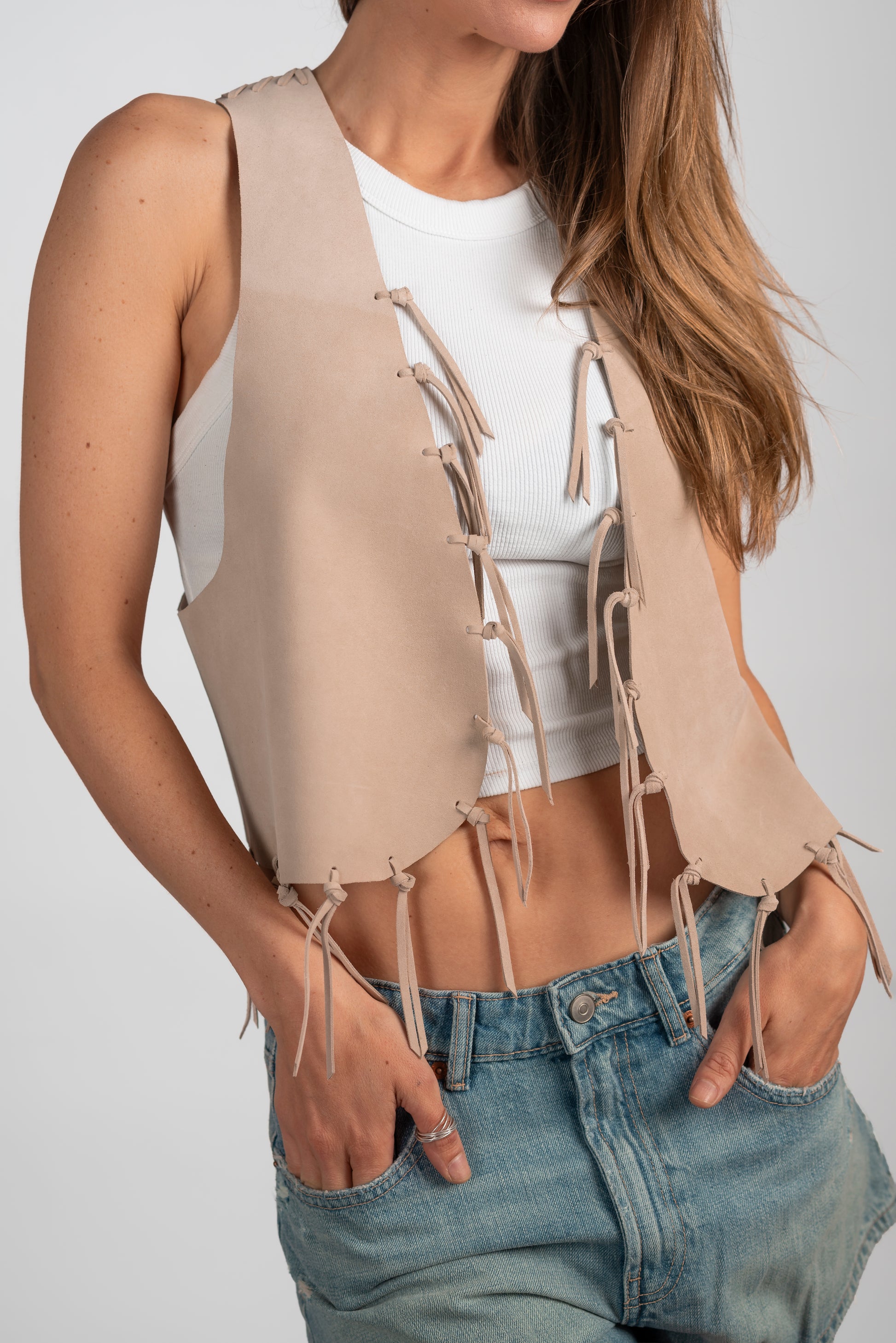 Espalda rebajada, detalle de costuras tramadas en cuero y flecos. Talla única.