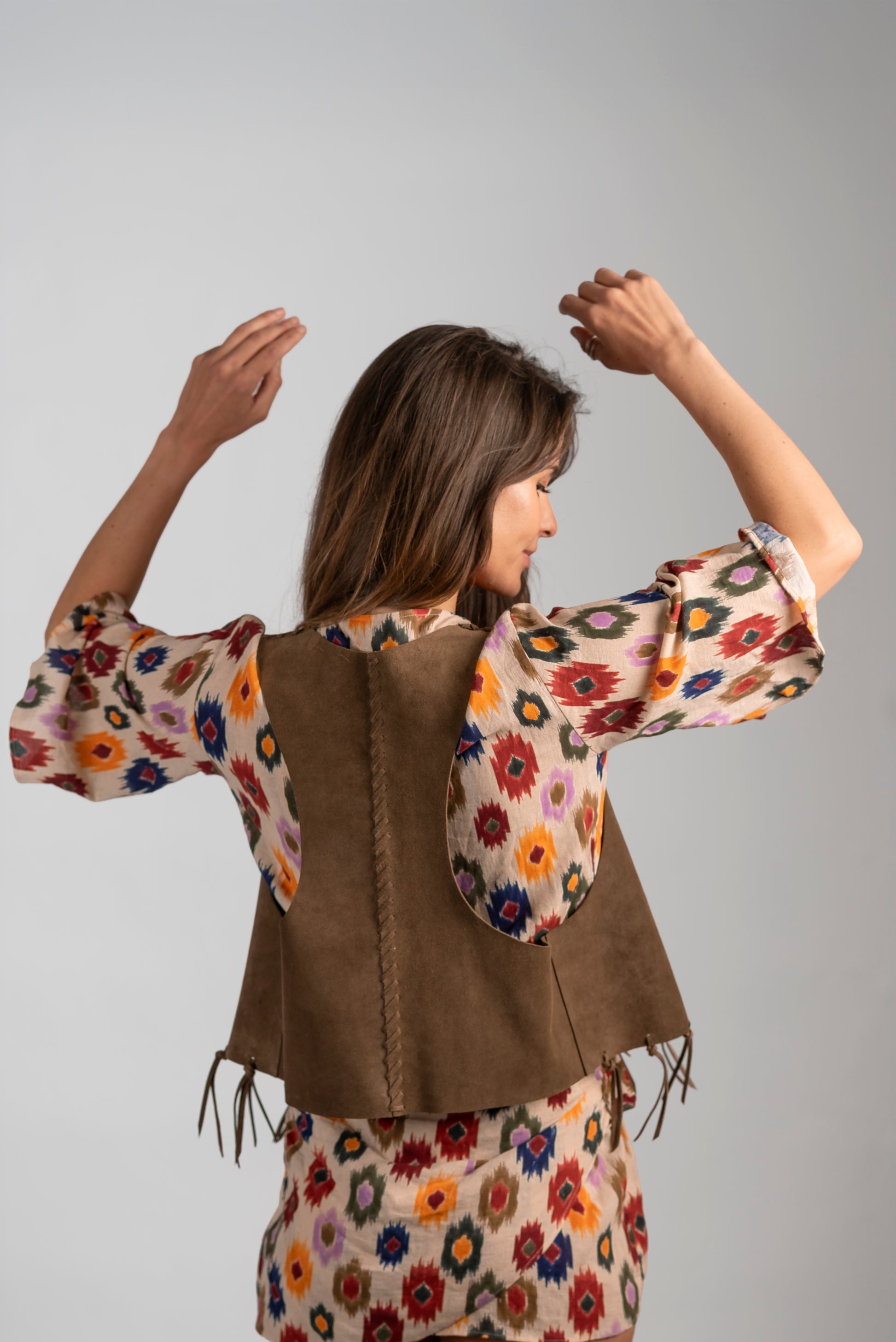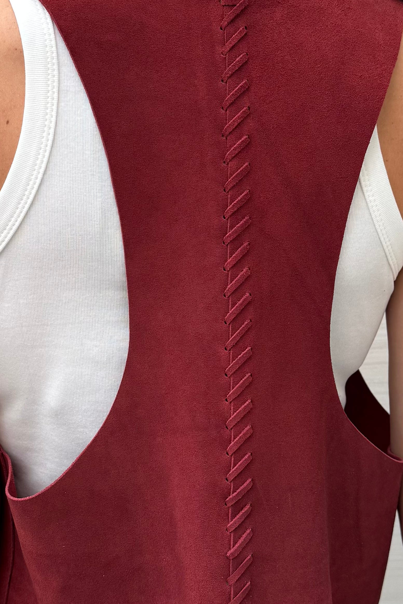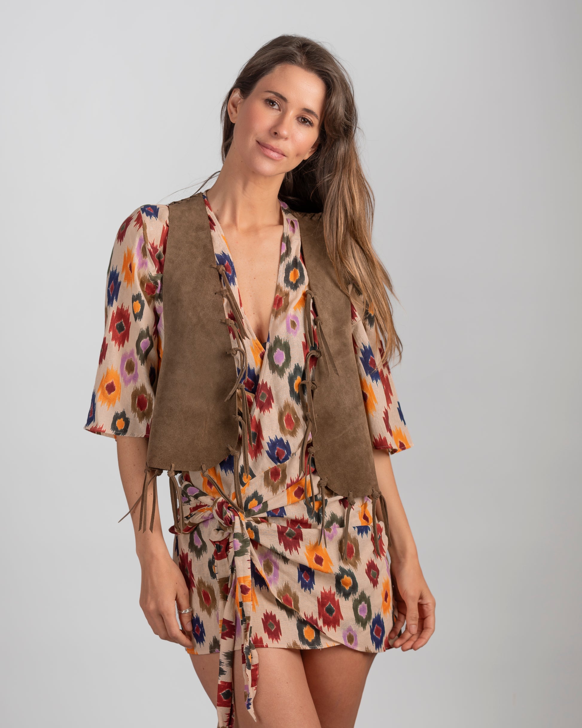 Espalda rebajada, detalle de costuras tramadas en cuero y flecos. Talla única.